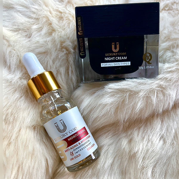 محتویات پک نقره ای ضد چروک و جوانساز صورت لاکچری کوین شامل کرم شب و سرم طلا لاکچری کوین می باشد :